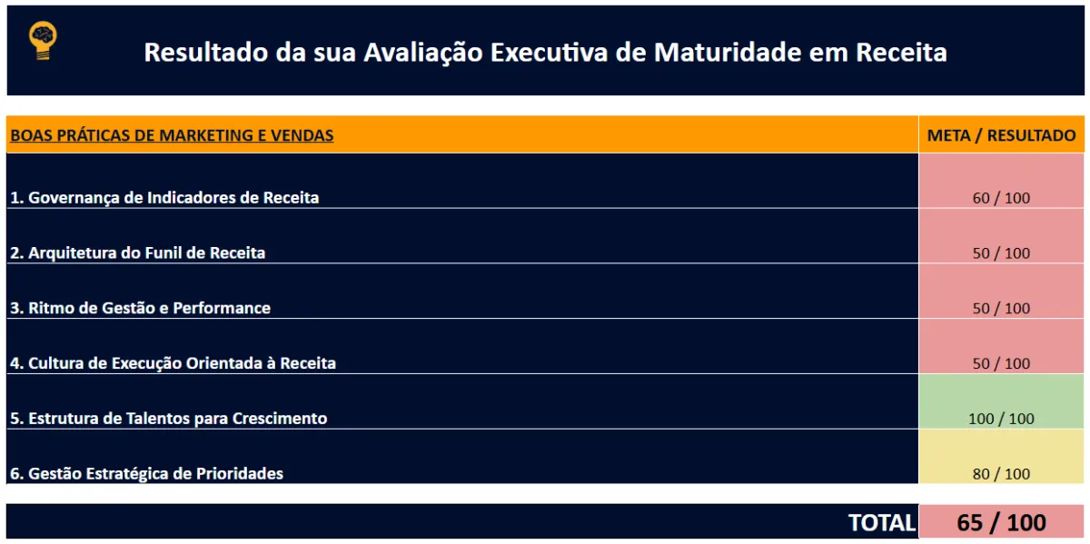 A Avaliação Executiva é uma leitura estratégica aplicada ao vivo, baseada em um modelo proprietário de maturidade em receita.